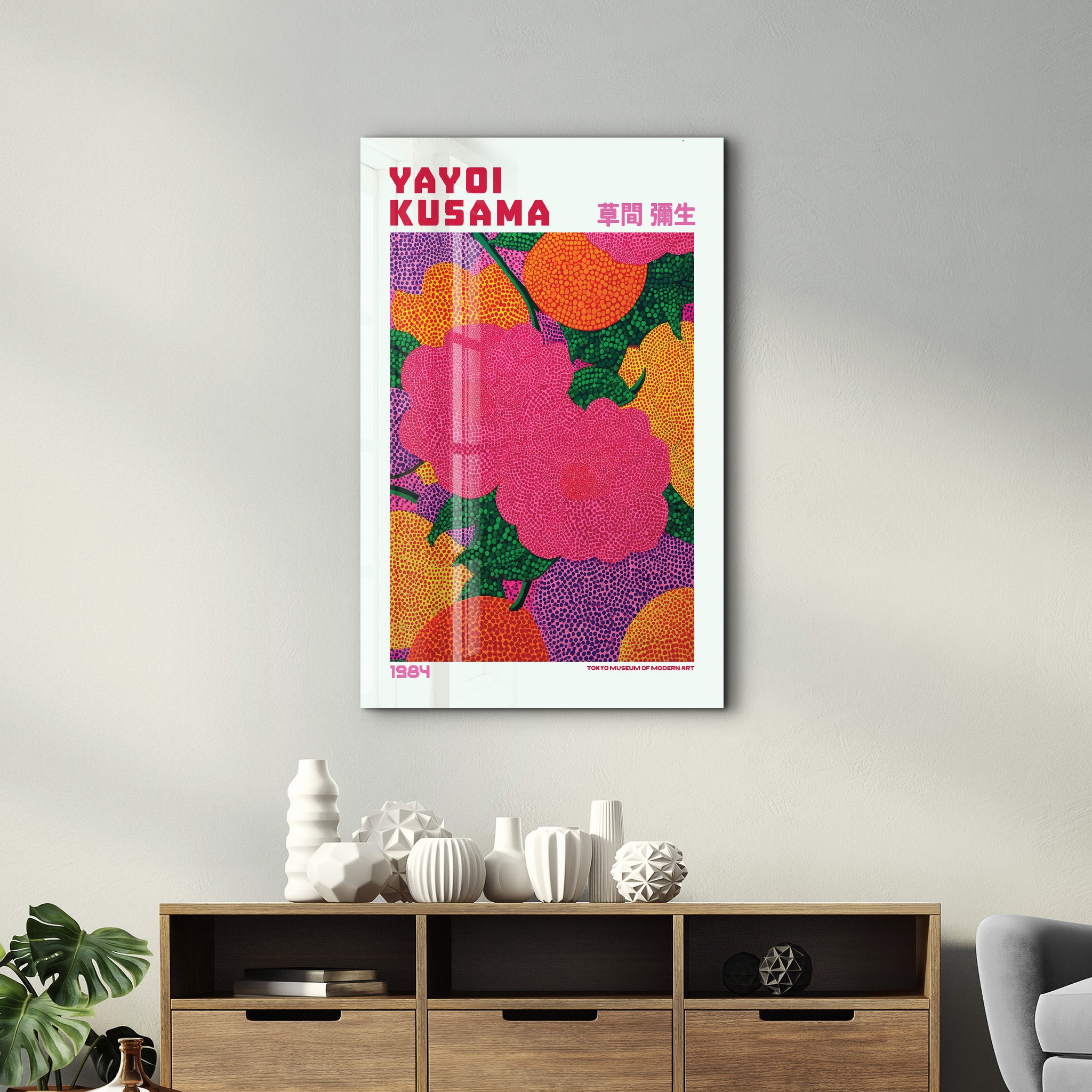 Add a bold burst of contemporary color to your space with this iconic Yayoi Kusama composition, inspired by her signature use of repetition, rhythm, and immersive pattern. Known worldwide for her hypnotic dot motifs and vibrant palettes, Kusama’s work transforms simple forms into powerful visual experiences.
