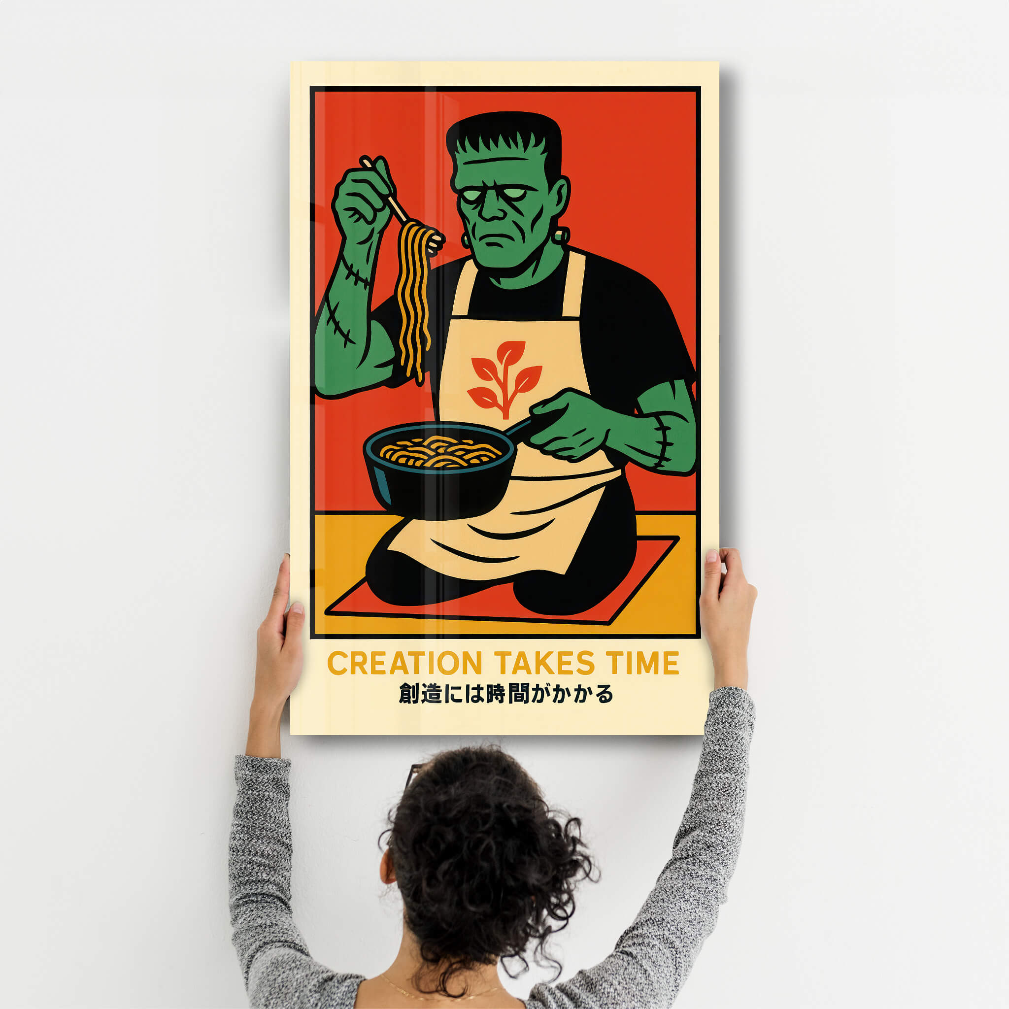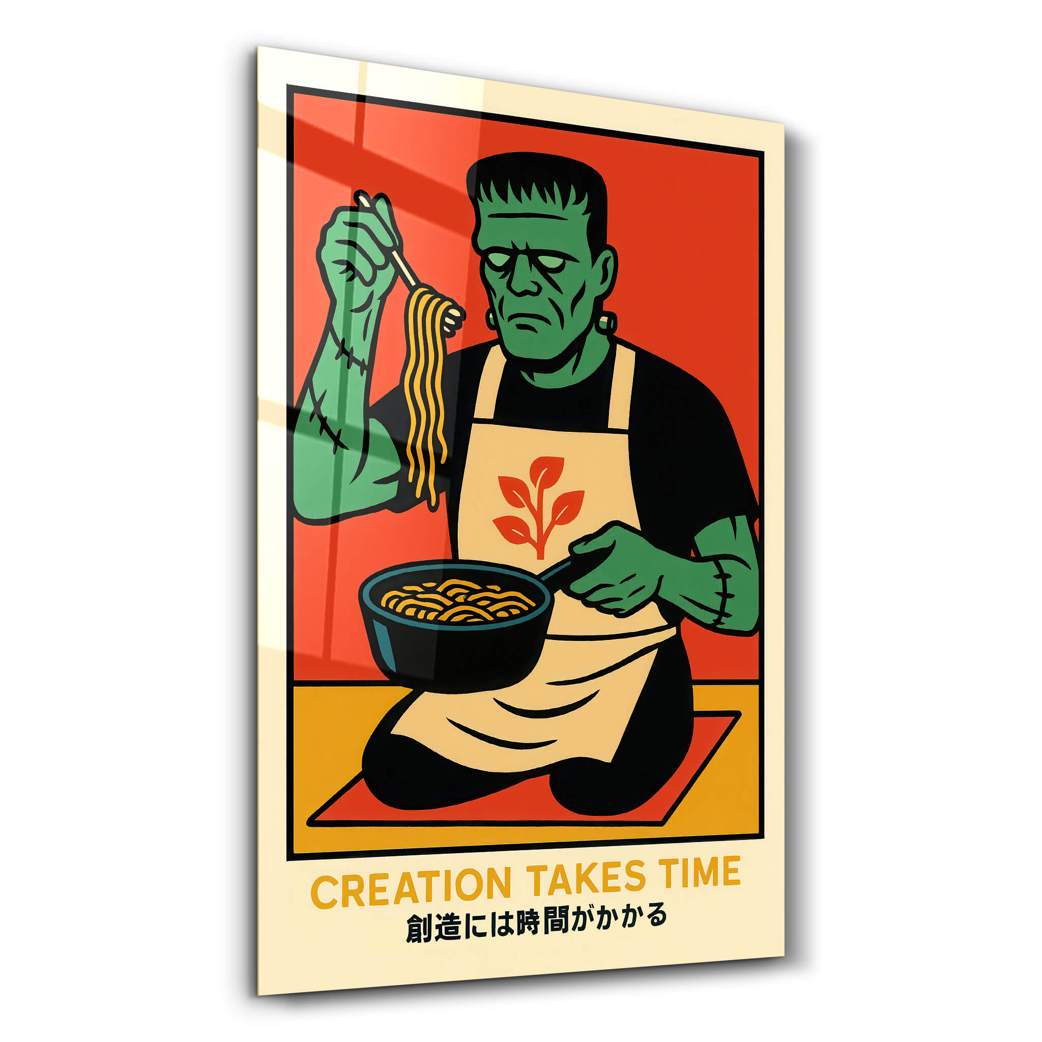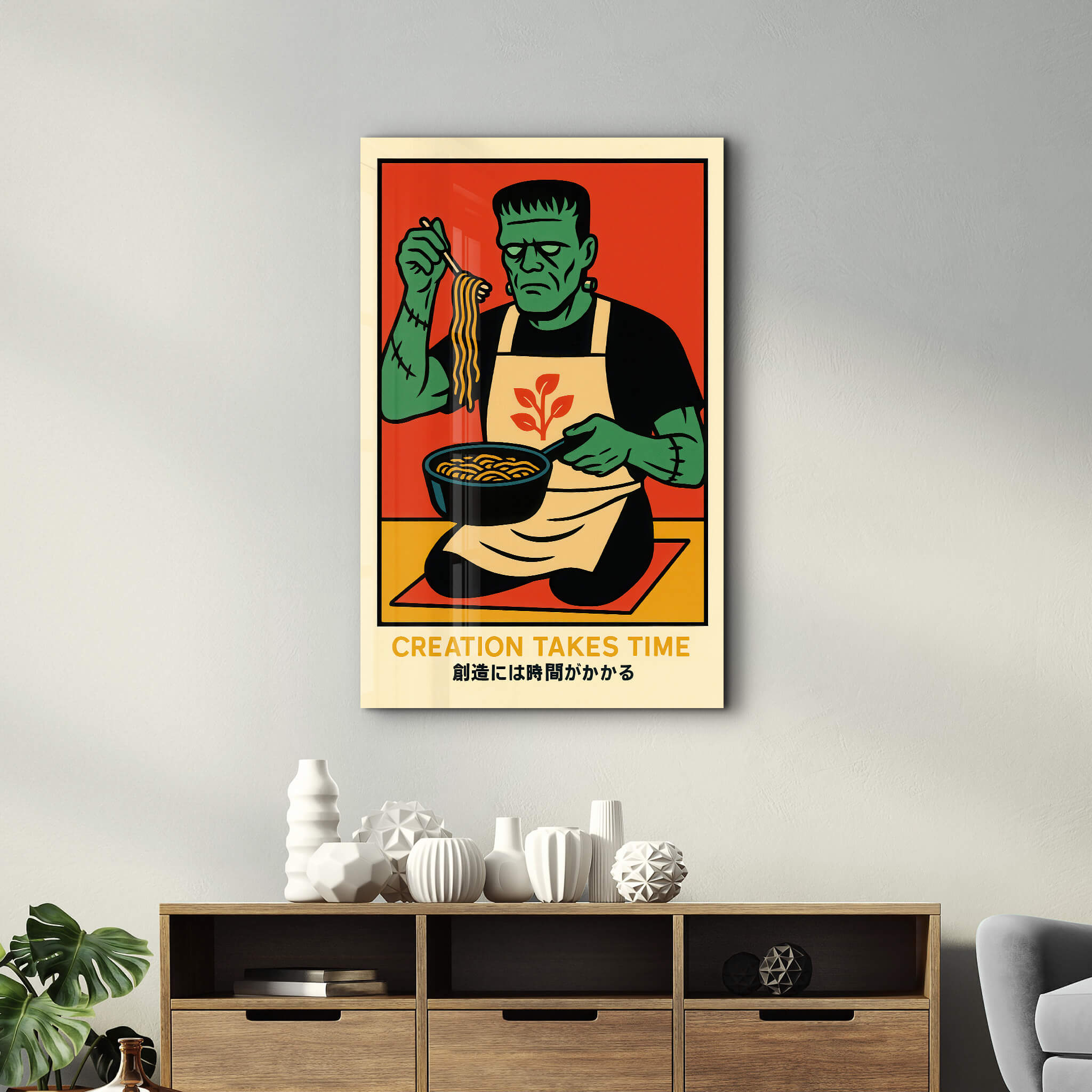 Unleash your love for bold design and subtle storytelling with our “Creation Takes Time” glass wall art—a perfect fusion of humor, pop culture, and philosophy. This piece features a green-skinned Frankenstein-like character, carefully cooking a pot of noodles, wearing a serene expression and a simple apron. It's an unexpected but perfectly balanced visual metaphor: even the most fearsome creations require care, patience, and yes, perhaps a little seasoning.