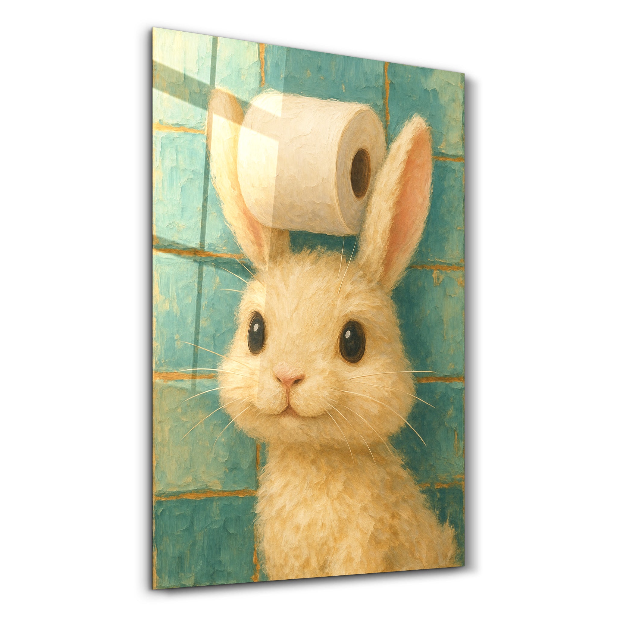 Overflowing with cuteness and a hint of mischief, Roll With It features an adorable bunny proudly balancing a roll of toilet paper between its ears. The soft, painterly texture and teal-tiled backdrop give it charm and warmth, while the unexpected twist makes it a standout in playful home decor. Printed on glossy 4mm tempered glass, this piece combines high-quality finish with delightful character.